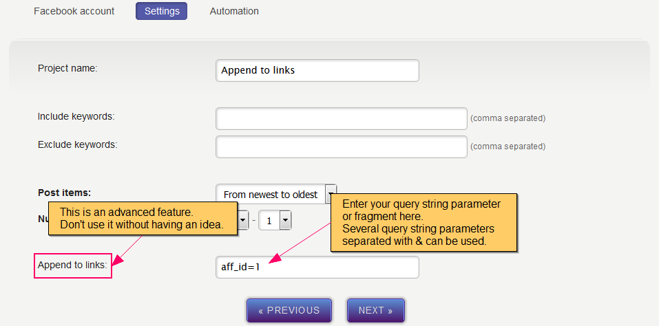 We hasten to inform you that a new feature was added to RSS to Facebook Poster. Fulfilling the suggestion of our good friend Jeff Mills we have added an option which allows you to append post links with text or tag. This can be any affiliate ID, tracking tags or anything else.